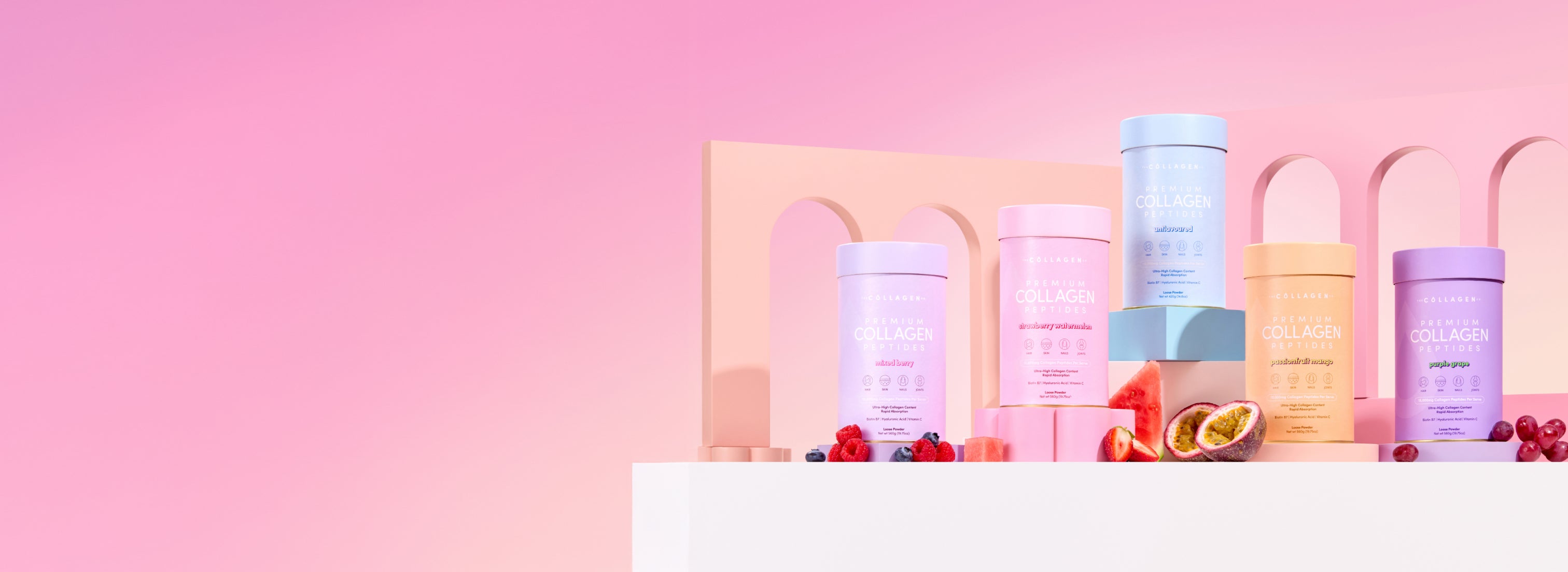 Your daily glow-up should be something to look forward to, which is why our Premium Collagen Peptides come in four equally delicious flavours: Strawberry Watermelon, Mixed Berry, Passionfruit Mango, and a versatile Unflavoured option.