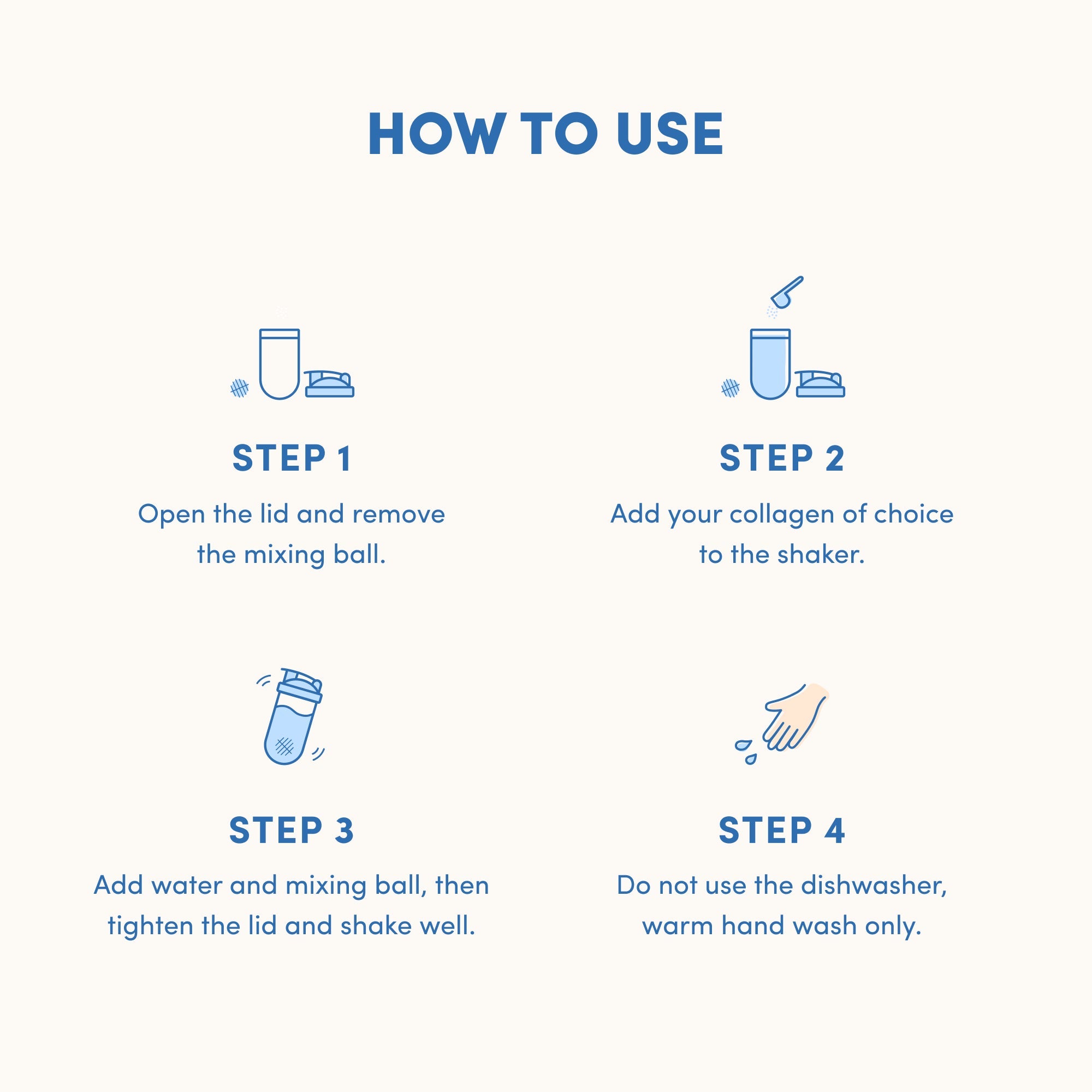 Open the cap and remove the mixing ball, add your collagen or glow shake to the bottle.