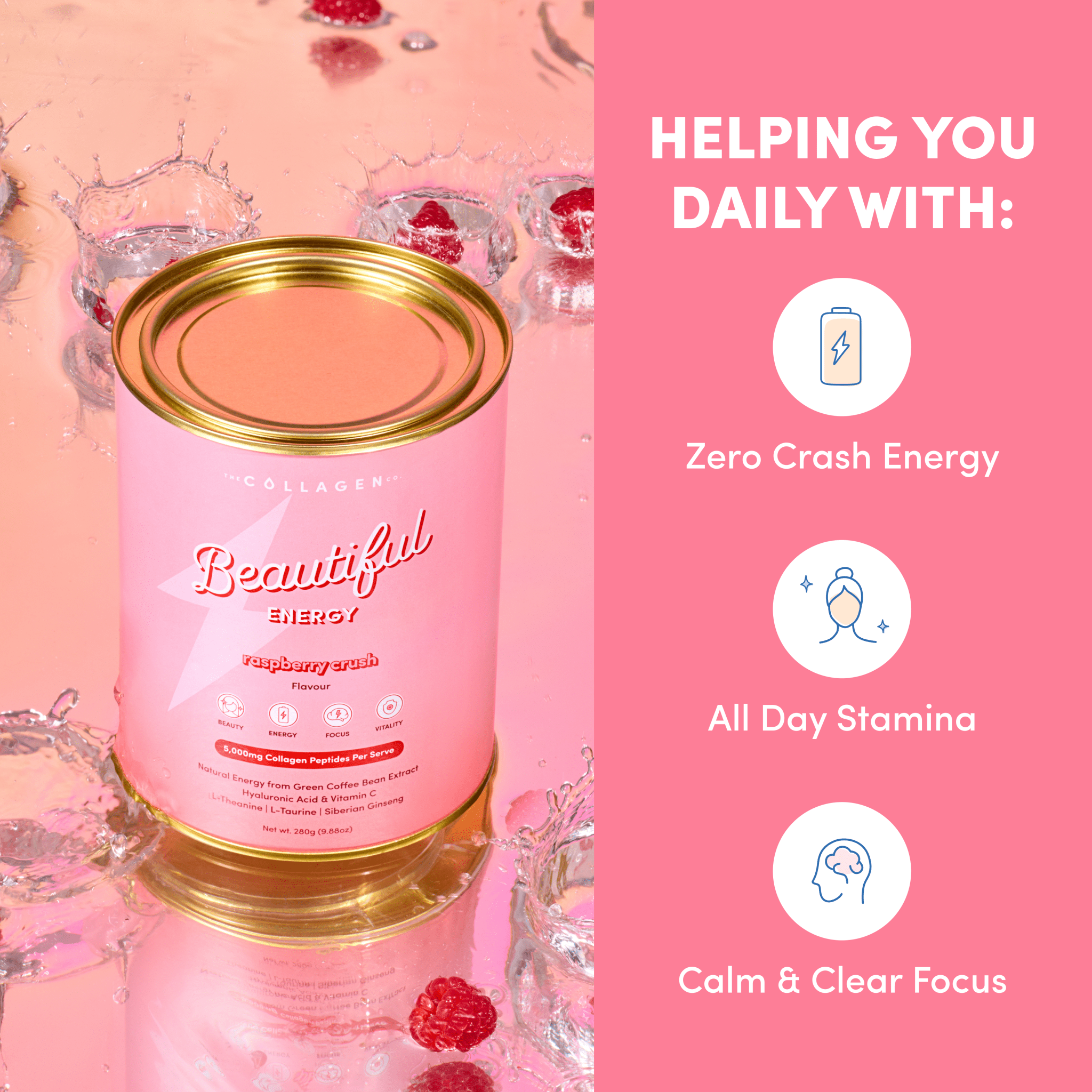 Beautiful Energy is a glow-first energy drink formulated to support focus, skin health, and gut comfort — without the crash, jitters, or artificial junk found in typical energy drinks. It’s powered by clean, natural ingredients like green coffee bean caffeine, hydrolysed collagen peptides, adaptogens, and vitamins to help you feel good and look great.