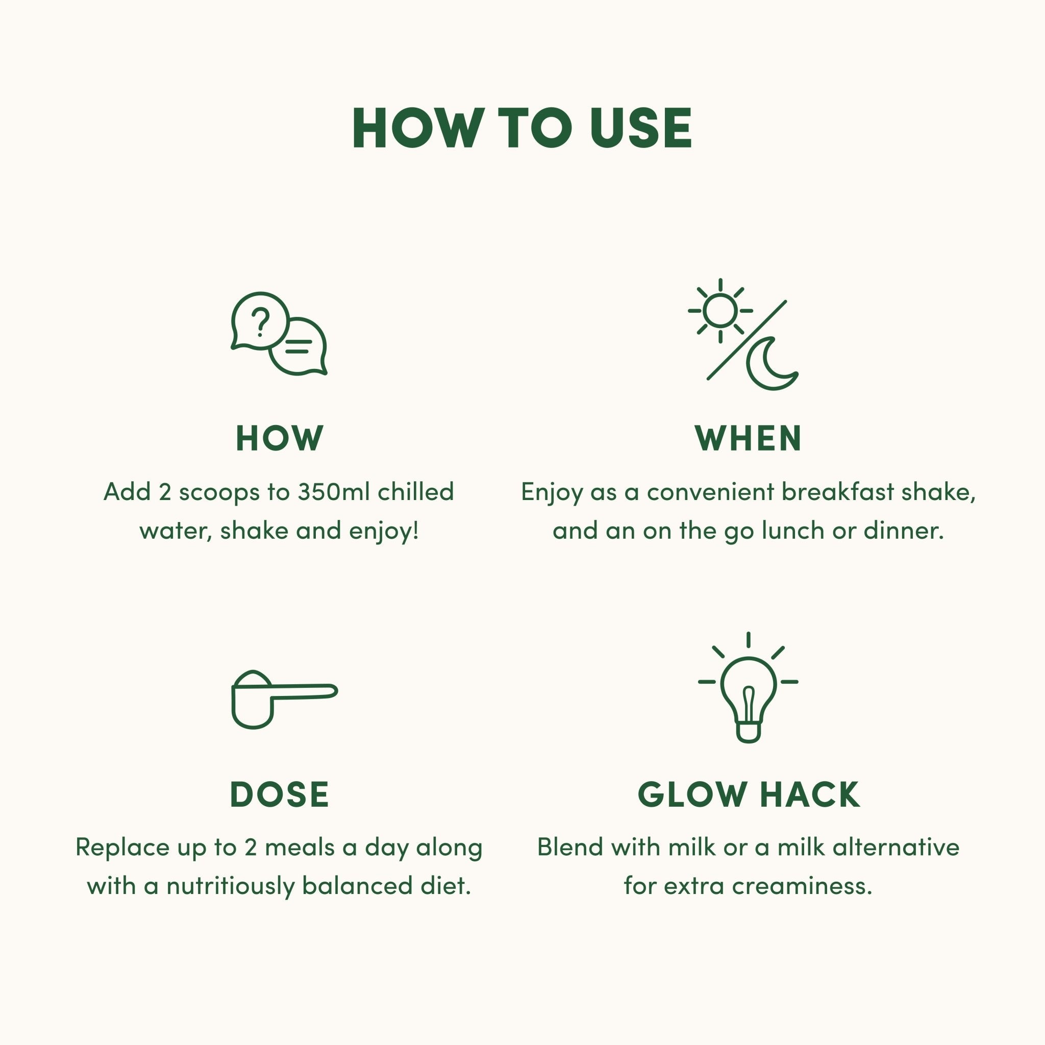 Add 2 scoops to 350ml chilled water, shake and enjoy!